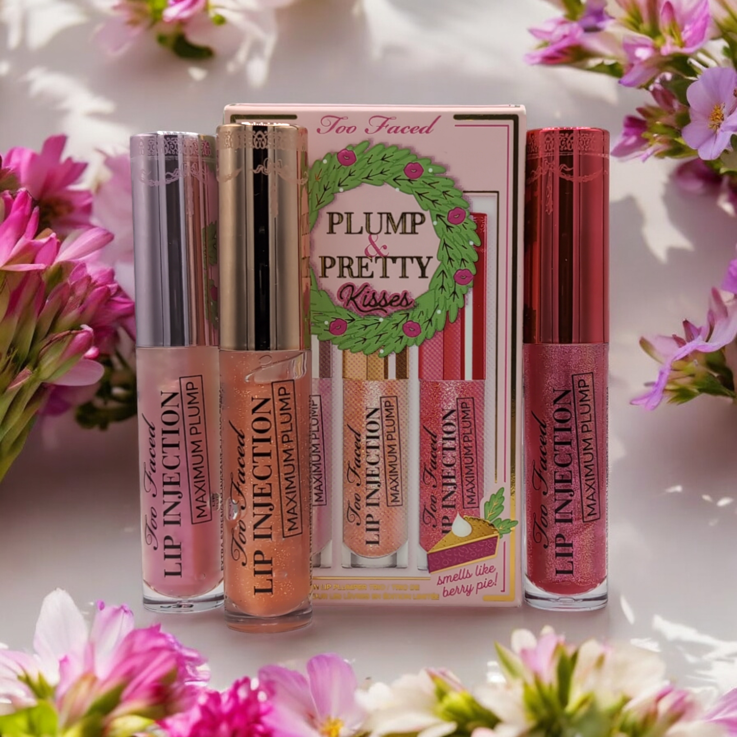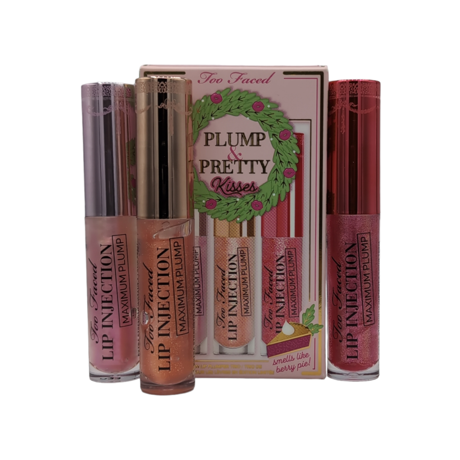 Too Faced Plump & Pretty Kisses set includes limited-edition travel sizes of iconic Lip Injection Maximum Plump, including an exclusive holiday shade! How to Apply: No character count but keep short and concise Apply directly on clean, dry lips with doe-foot applicator morning and night and throughout the day as needed for hydration and plumping. Consumer Results (if applicable): Leaves lips feeling plumped 96% (at 1 week) Leaves lips feeling hydrated 96% (Immediately) Leaves lips looking re-volumized 98% (at 1 week) Leaves lips feeling softer and smoother over time 97% (at 1 week) *In a study of 106 women